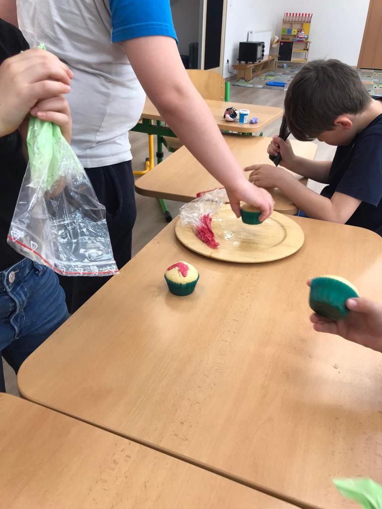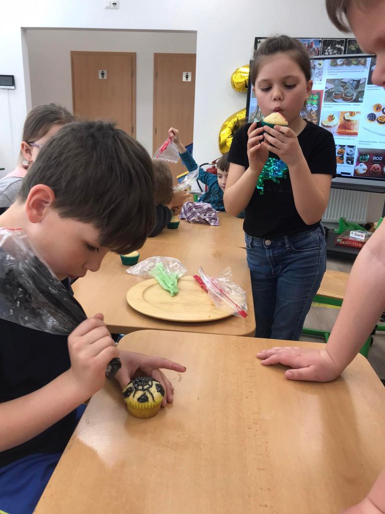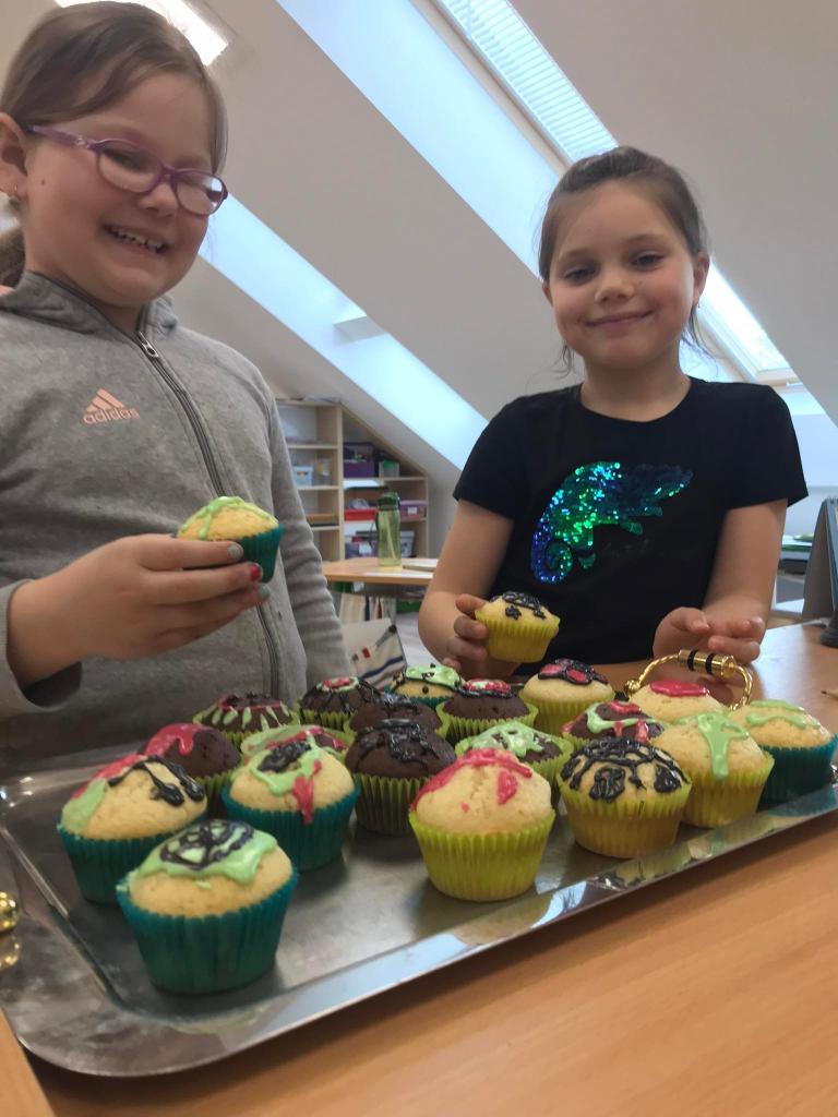 V I. oddělení ŠD se uskutečnilo čarodějnické pečení. Děti si upekly čokoládové a kokosovo-vanilkové muffiny, které si poté ozdobily čarodějnickými obrázky pomocí barevných polev.